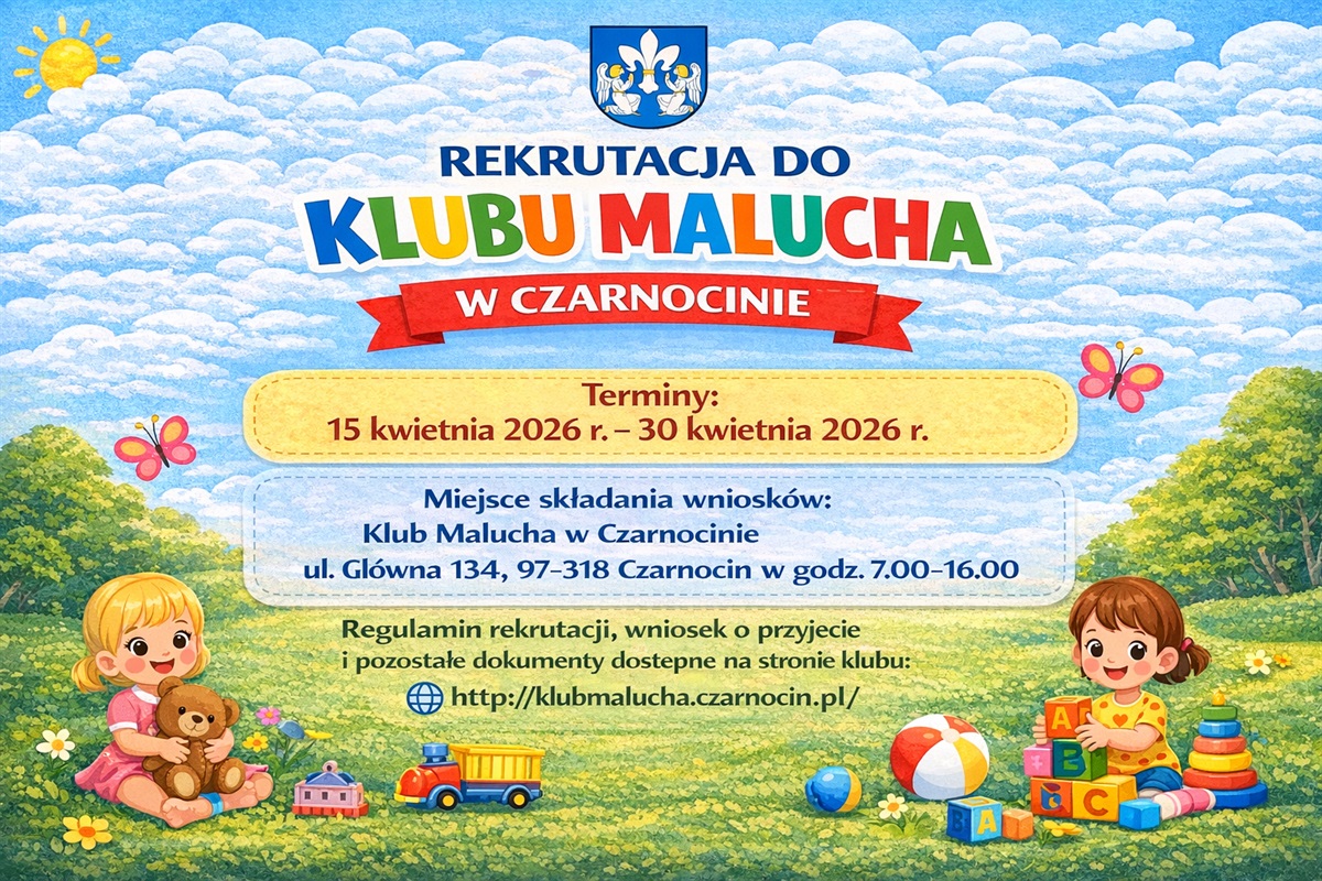 w dniach 15–30 kwietnia 2026 r. odbędzie się rekrutacja do Klubu Malucha w Czarnocinie. Regulamin rekrutacji wraz z załącznikami znajduje się w zakładce REKRUTACJA.